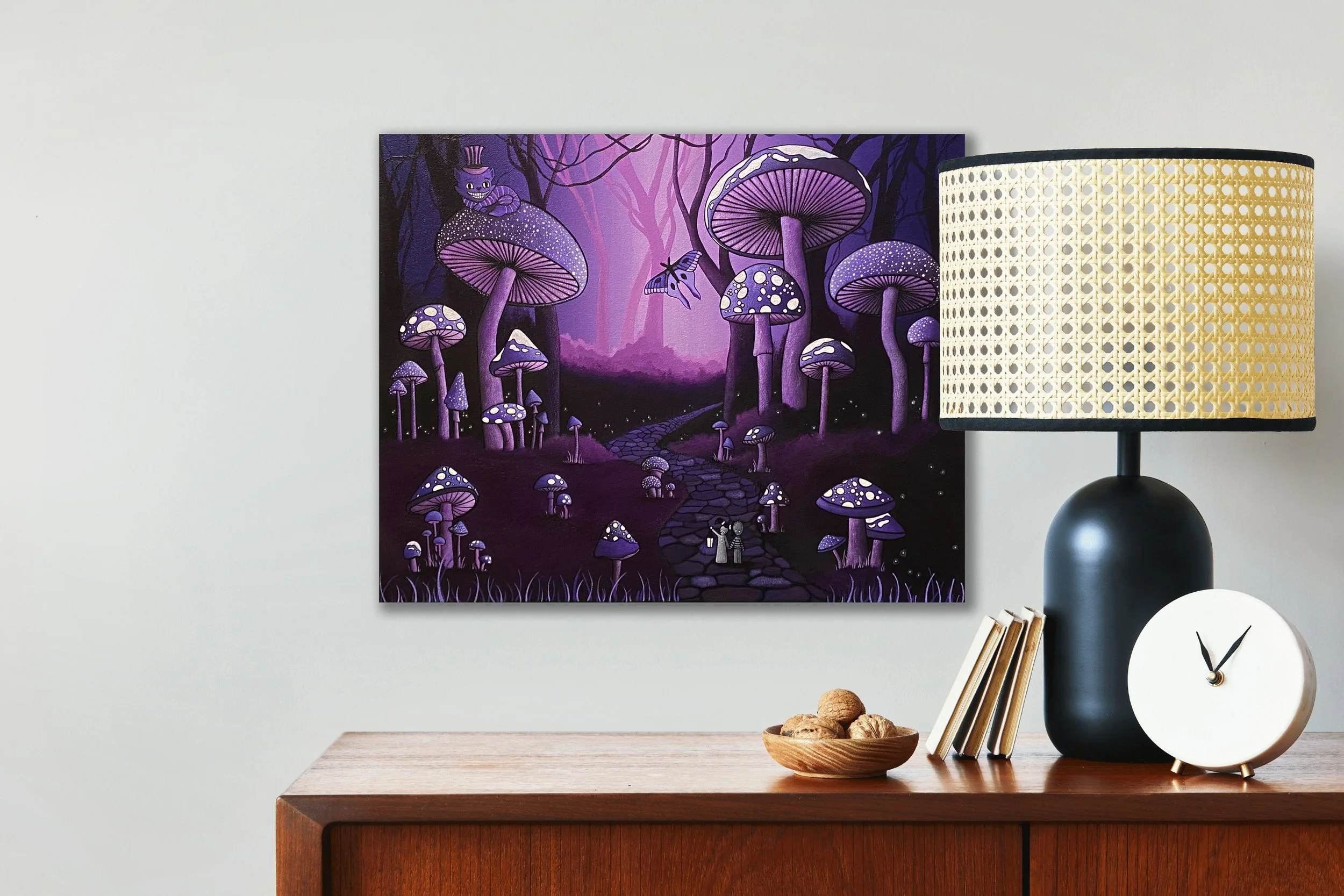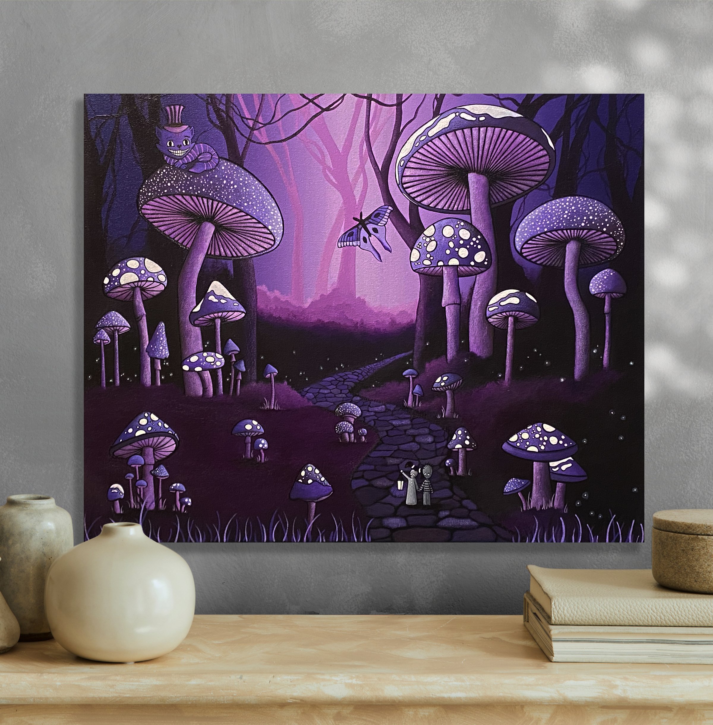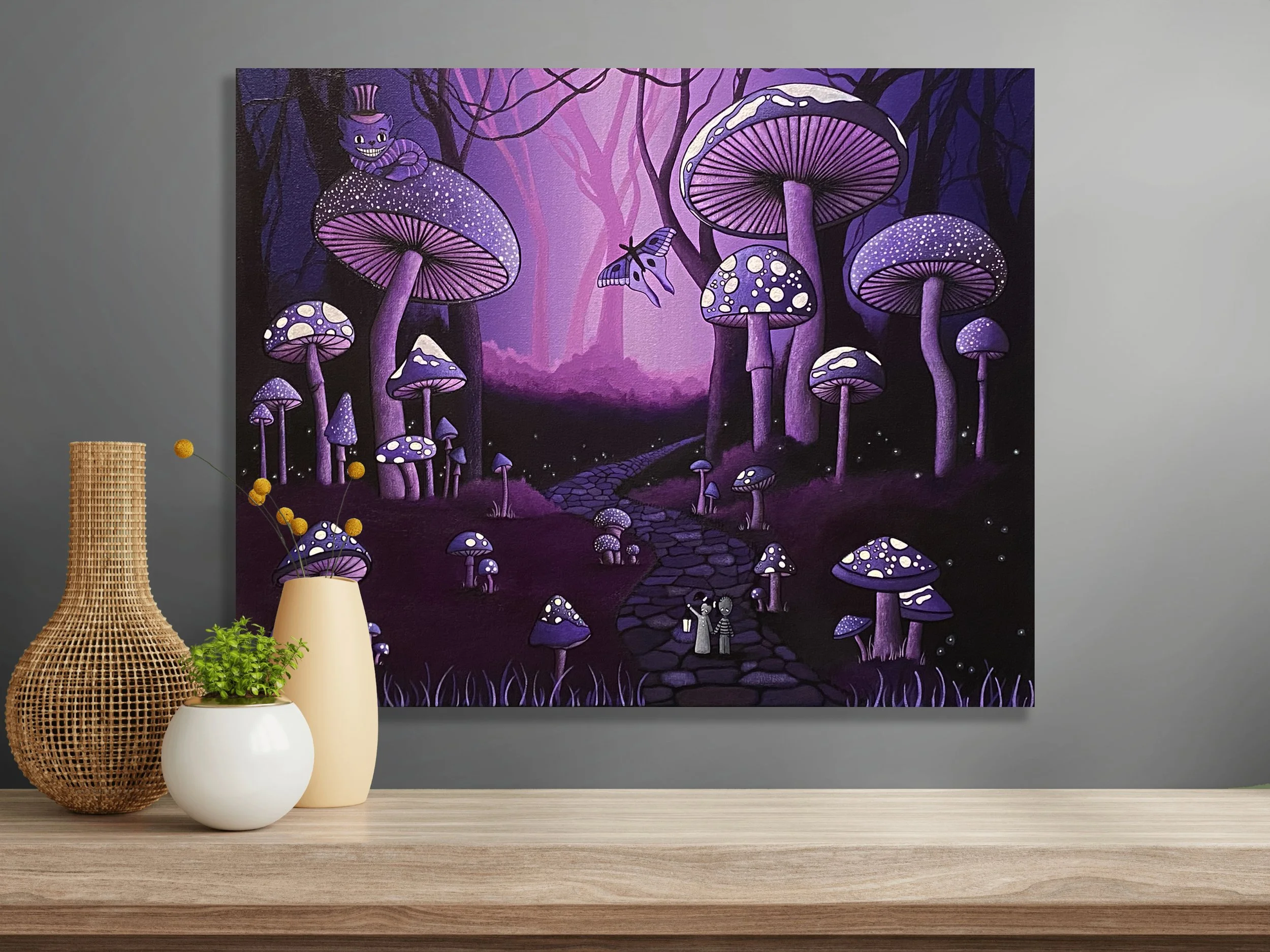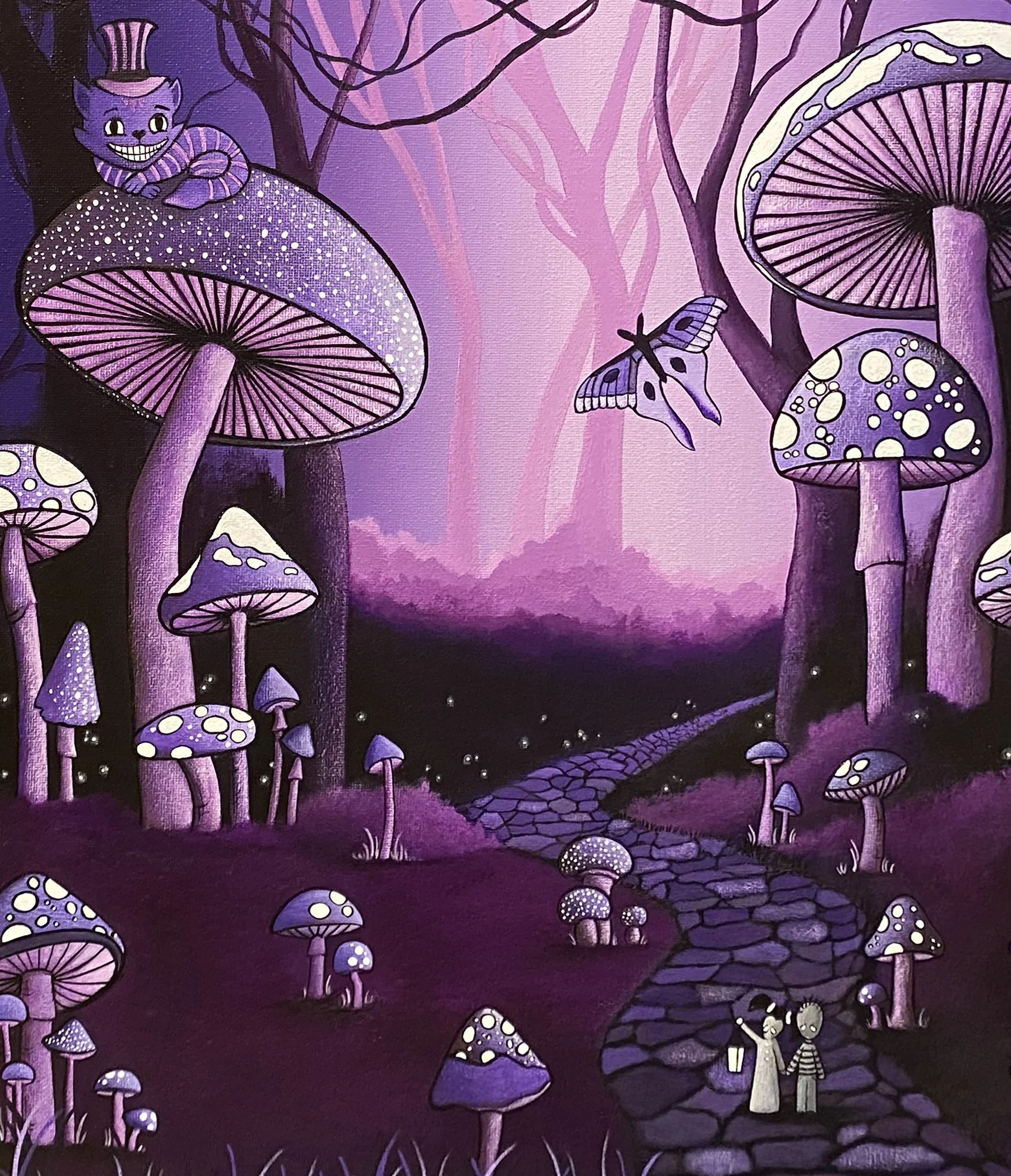 In this surreal dreamscape, our two small travelers navigate a winding cobblestone path through a forest of towering, whimsical fungi. Watched over by a grinning cat and a drifting Luna moth, this piece captures the quiet tension between wonder and the deep unknown.