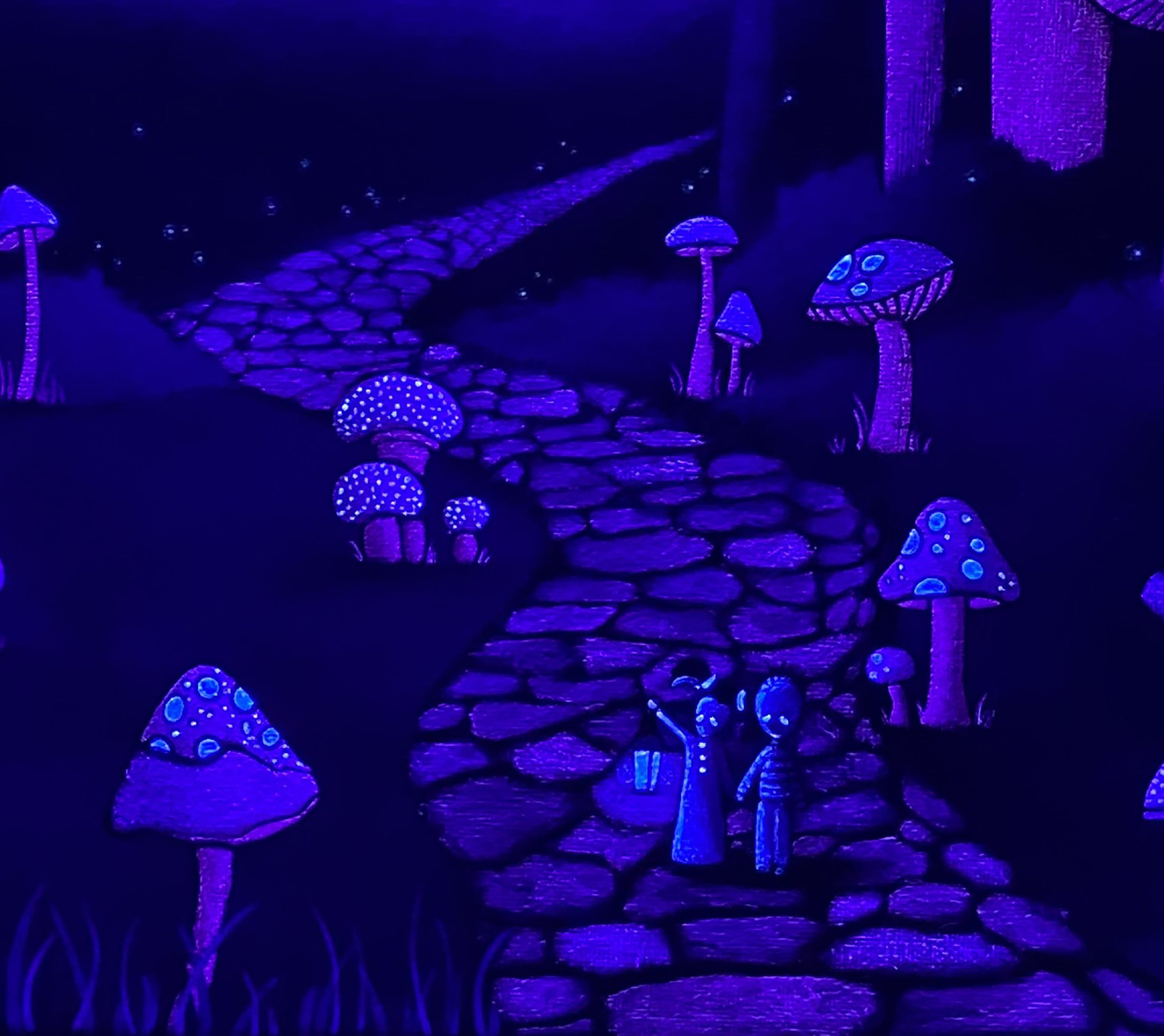 BY NIGHT: Under ultraviolet light, the scene truly comes alive. The mushrooms, characters, and background shift into intense, vibrant neon purples, deep cyans, and piercing blues, creating an entirely different, glowing atmosphere.